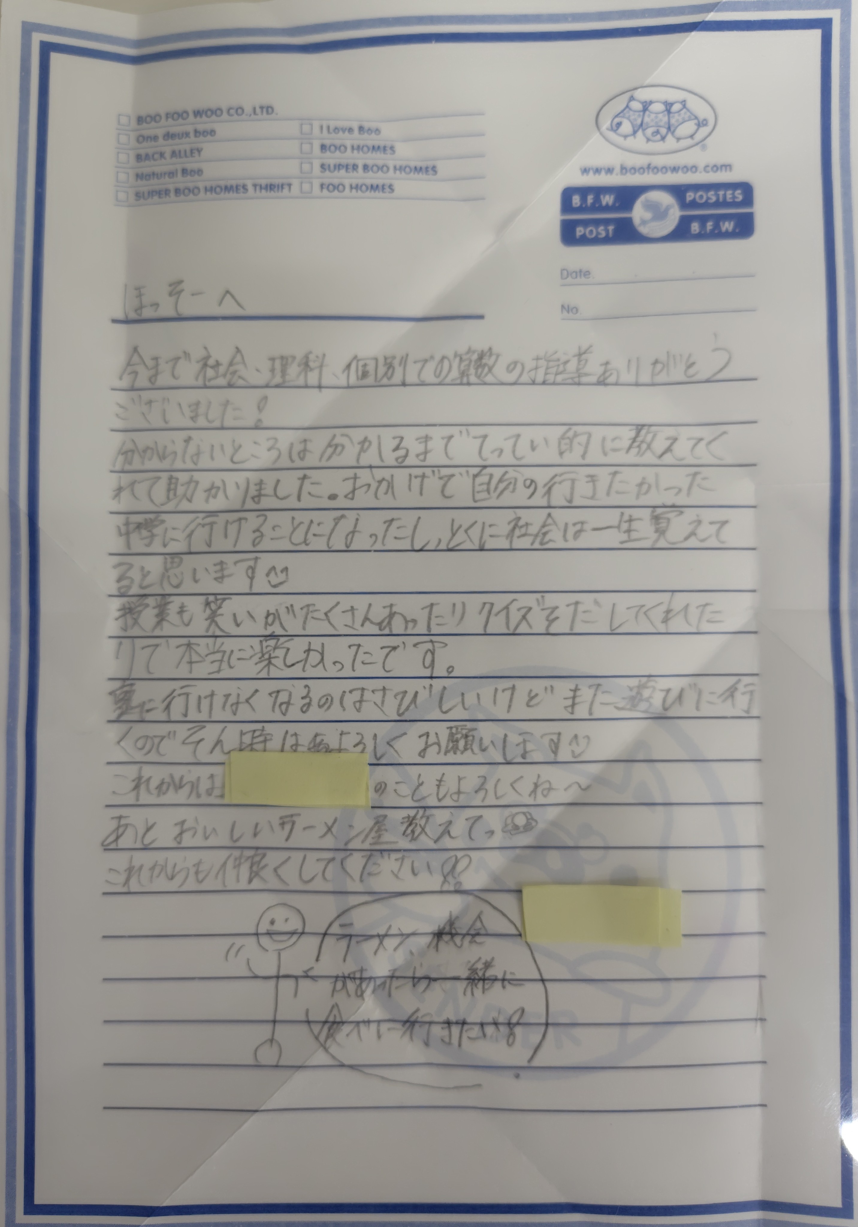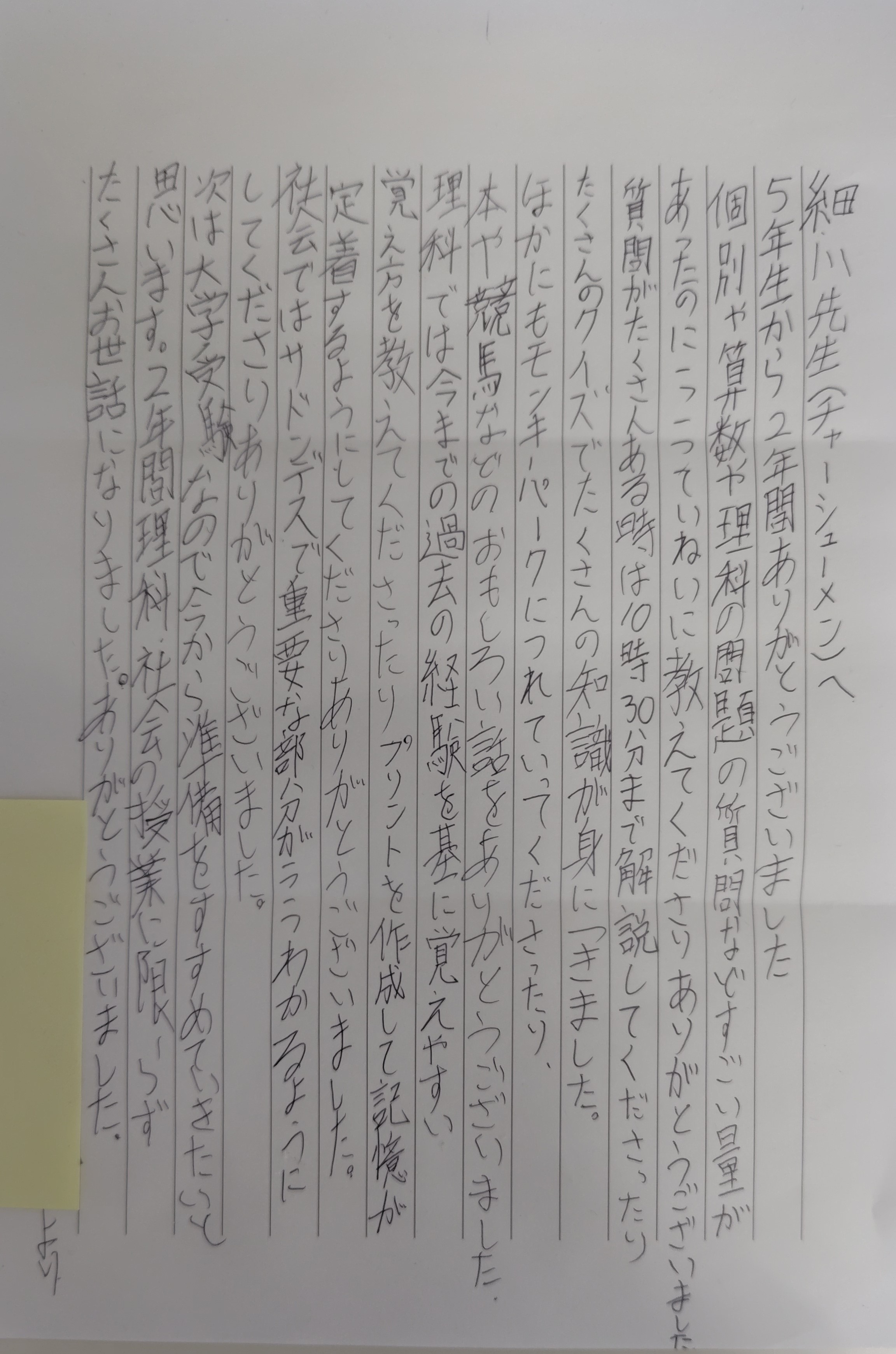 卒塾生の子から、大変ありがたく、そして嬉しいお手紙をいただきました!